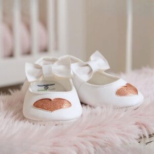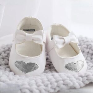 حذاء بناتي أبيض مزين بقلب لامع وربطة فيونكة
