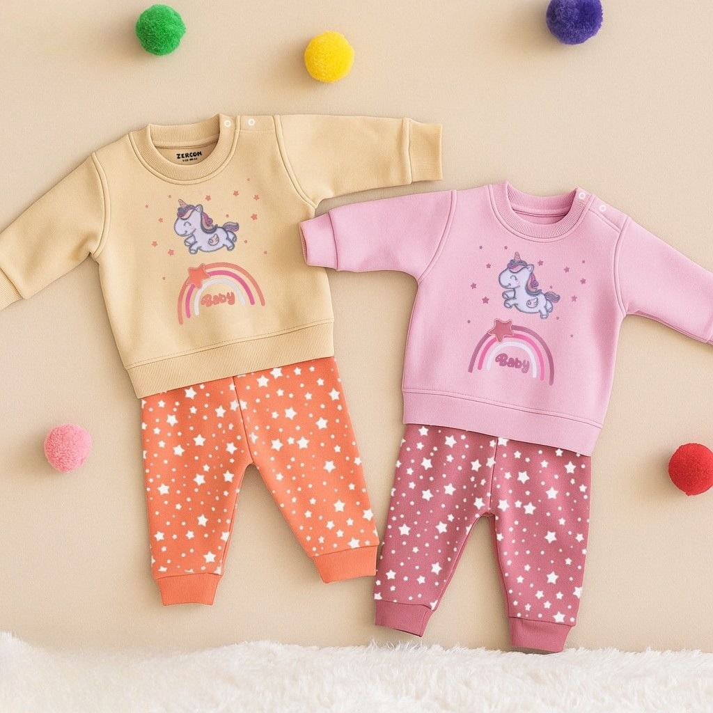 طقم بيبي قطني شتوي مطبوع – تصميم يونيكورن وقوس قزح